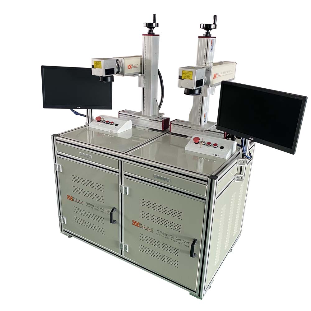 上圖為我司專業研發定制的雙頭光纖激光打標機,該設備專用于精密汽車配件打標,能在產品表面,正反面同時標記不同內容,大大提高了生產效率,滿足了不同型號產品同時打標的要求。